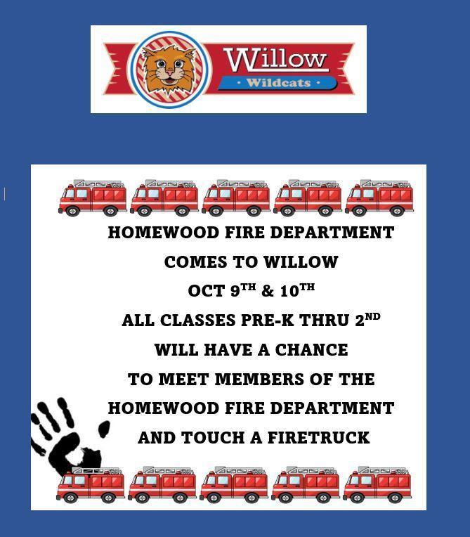 HFD at Willow School All classes will have the chance to meet the Homewood Fire Department and touch a firetruck on October 9th and 10th.